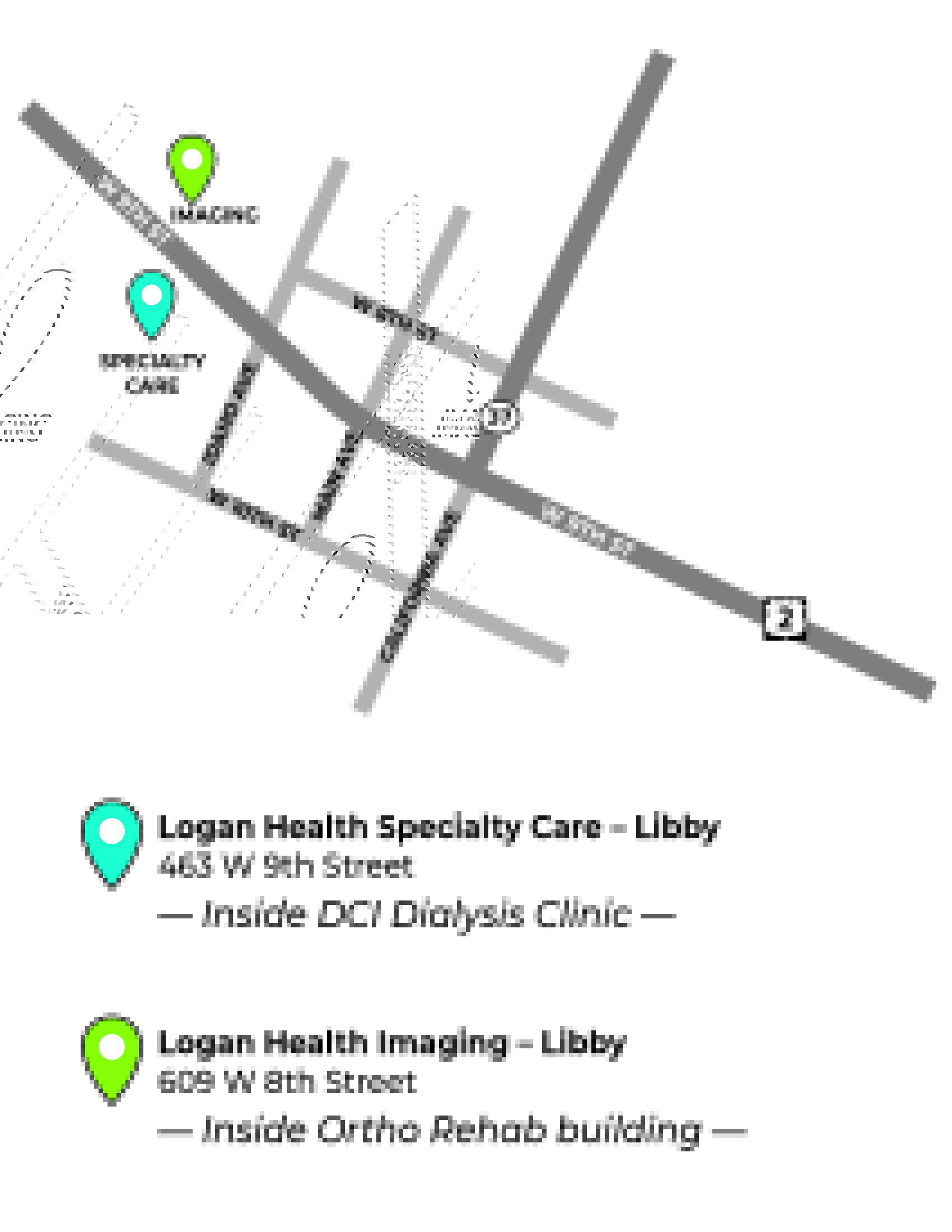Logan Health Specialty Care, a department of Logan Health Medical Center, hosts a variety of visiting specialists who see patients in Libby for their health care needs. It is interimly located at 463 W 9th Street in Libby, in the DCI Dialysis Clinic. Imaging services in Libby will are offered at 609 West 8th Street in the OrthoRehab Building. Services include nuclear medicine (on Wednesdays via the mobile unit), echocardiograms, and stress tests. These temporary locations are a part of Logan Health’s continued plan to provide care in Libby while a permanent clinic location is identified.